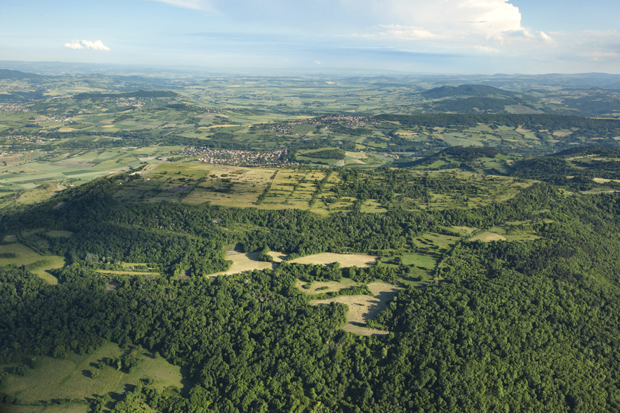 Depuis Gergovie, la vue embrasse l’ensemble des massifs caractéristiques du département du Puy-de-Dôme et notamment- à l’est, les hauts plateaux granitiques du Forez et du Livradois,